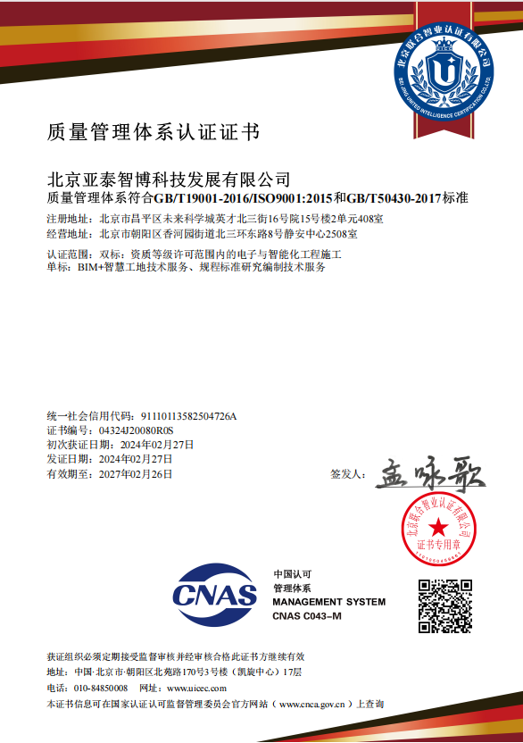 近日,北京公海赌赌船官网jc710智博科技发展有限公司顺利取得ISO9001质量管理体系、ISO14001环境管理体系、ISO45001职业健康安全管理体系认证,管理体系覆盖的产品和服务范围包括电子与智能化工程施工;BIM+智慧工地技术服务、规程标准研究编制技术服务。此次三标管理体系认证证书的取得,为智博科技公司增强市场竞争力、提升公司信誉度提供了强有力的保障。(李京月)