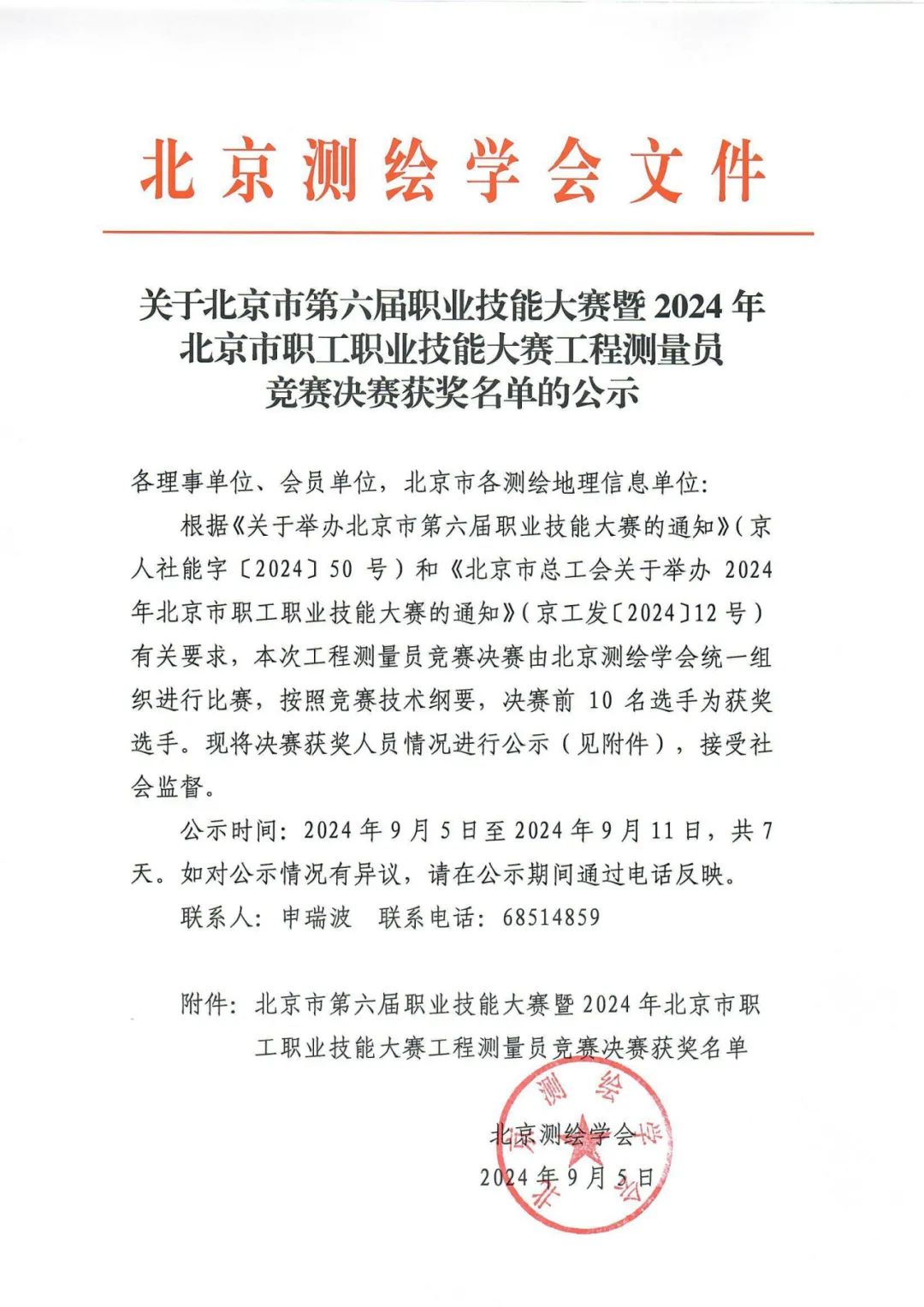 近日,北京市第六届职业技能大赛暨2024年北京市职工职业技能大赛工程测量员决赛圆满落幕。经过多轮激烈比拼,集团职工米立广在决赛中凭借出色的表现,荣获个人第五名的好成绩,成为北京城建集团在此次大赛中唯一获奖选手。